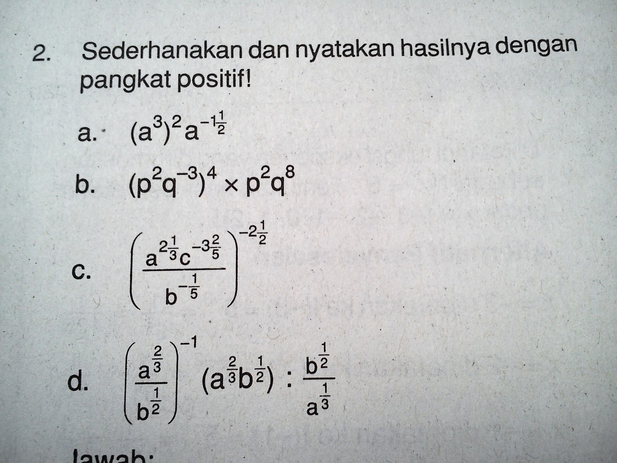 May 11, 2021 · contoh soal bilangan berpangkat dan pembahasannya. Sifat sifat ini nantinya digunakan sebagai salah satu cara menyederhanakan bentuk pangkat tersebut. Sederhanakan dalam bentuk pangkat positif. Sederhanakanlah bentuk aljabar berikut ini!! Bilangan berpangkat bulat positif pada umumnya mempunyai sifat sifat di dalamnya.