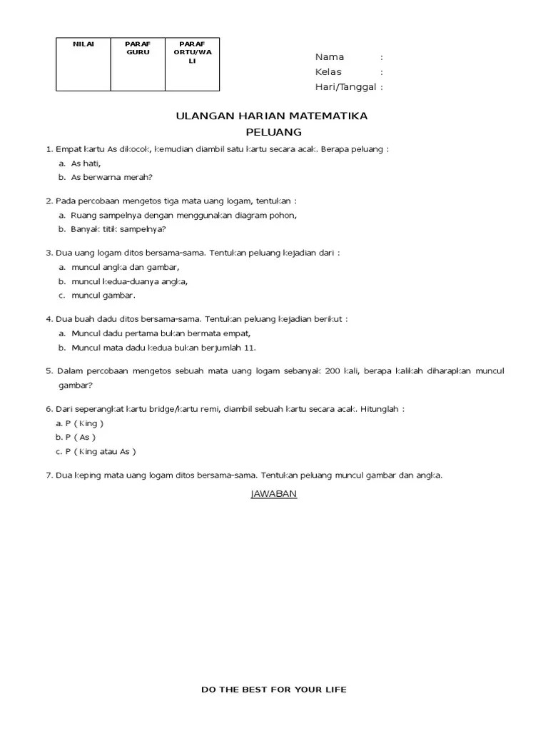 Peluang mendapatkan kartu as adalah… seperangkat kartu bridge. 13 soal 1 peluang muncul muka dadu nomor 5 dari pelemparan sebuah dadu satu kali.